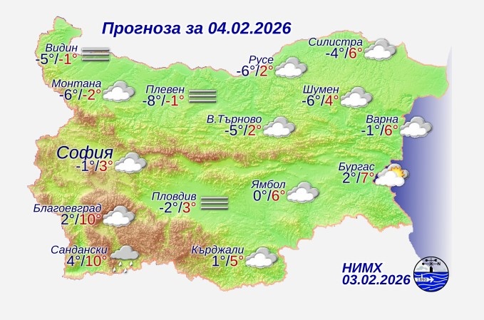 Времето в страната ще е предимно облачно, на места в низините и котловините и мъгливо. След обяд от югозапад ще започнат валежи от дъжд, които ще продължат и през нощта срещу четвъртък. Вятърът ще е слаб, в много райони и ще стихва, а в Североизточна България и в районите близо до северните планински склонове ще духа умерен вятър от юг-югоизток. Минималните температури ще бъдат предимно между минус 8° и минус 3°, по-високи в Южна България, а максималните – между 4° и 9°, по-ниски в районите с трайна мъгла. В София минималната температура ще бъде около минус 1°, а максималната – около 3°.