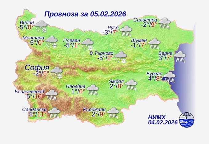 Валежите от дъжд ще обхванат почти цялата страна. В западните и централните части на Северна България, където ще е тихо, ще има поледици. Значителни по количество ще бъдат валежите в Рило-Родопската област, на места в Източна България и централните райони на Стара планина. Ще духа до умерен вятър от юг-югоизток. Минималните температури в Северна България и високите полета на Западна ще бъдат между минус 6° и минус 1°, в южната половина от страната и по Черноморието - между 1° и 6°, в София - около минус 2°. Максималните температури в западните и централни части на Северна България ще бъдат между 0° и 2°, в останалата част от страната – предимно между 5° и 10°, в София – около 5°.