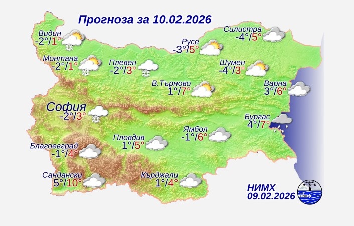 Днес облачността ще е значителна. Преди обяд на места в югоизточните райони ще бъде с превалявания от дъжд, а почти през целия ден в северозападните и планинските – от сняг. Вятърът ще е слаб, в Източна България до умерен от изток-югоизток. Максималните температури ще бъдат предимно между 2° и 7°, в София – около 3°.