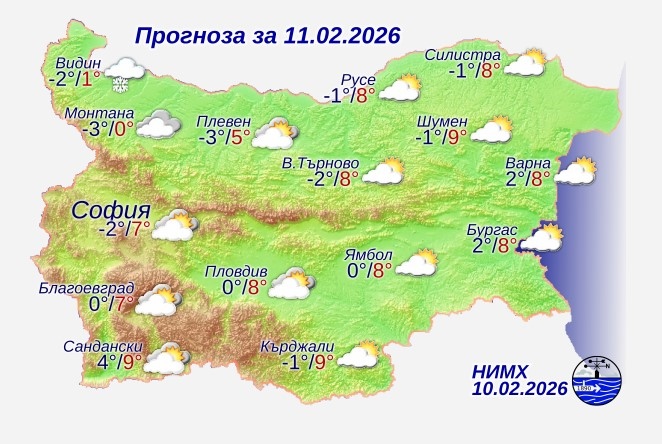 Днес преди обяд облачността ще е значителна, а над Северозападна България и Горнотракийската низина ще има ниска слоеста облачност или мъгла. На изток ще е предимно слънчево, а след обяд и в южната половина от страната облачността ще се разкъса до предимно слънчево време. Ще духа слаб вятър от южната четвърт. Максималните температури ще бъдат предимно между 4° и 9°, по ниски в Северозападна България, където ще остане облачно и мъгливо през целия ден. В София максималната температура ще е около 7°.