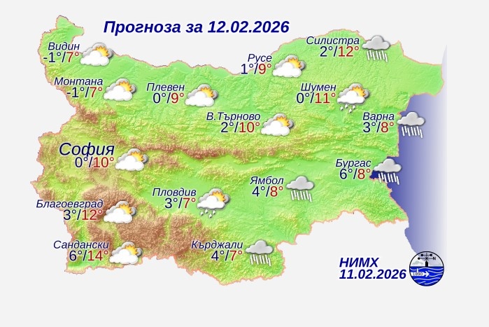 Днес в по-голямата част от Южна България, а след обяд в Източна ще има валежи от дъжд. През деня облачността, главно над Западна и Централна България, временно ще се разкъса. В Източна България и по долината на Струма ще духа слаб до умерен южен вятър. Преобладаващите максимални температури ще бъдат между 7° и 12°, в София – около 10°. През нощта срещу петък валежите и в Източна България ще спрат, но от югозапад ще започнат нови, които след полунощ ще обхванат Южна България.