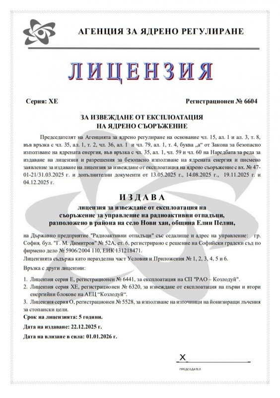 Агенцията за ядрено регулиране издаде на Държавно предприятие „Радиоактивни отпадъци“ първата електронна лицензия за извеждане от експлоатация в страната. Документът е в сила от 1 януари 2026 г. за срок от пет години и определя изискванията за безопасност при извеждане от експлоатация на Постоянното хранилище за радиоактивни отпадъци край с. Нови хан, община Елин Пелин.