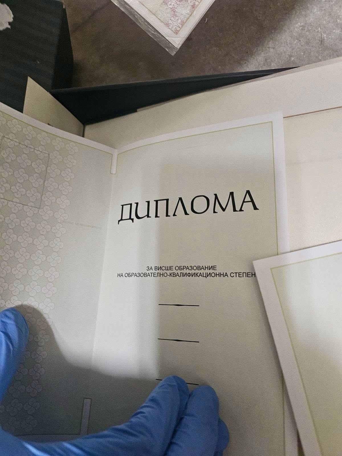 При извършените действия по разследването са открити множество празни бланки, заготовки, печати на различни университети, училища, нотариуси и частни фирми, както и материали и специализирана техника за дигитален печат.