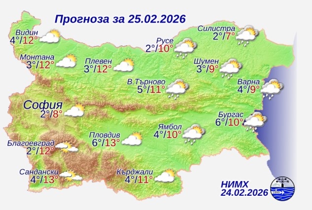 Днес облачността над страната ще е променлива, над Източна България по-често значителна и на отделни места там ще има слаби превалявания от дъжд, които към вечерта, с понижението на температурите, отново ще се примесват със сняг. Повече слънчеви часове ще има в Западна България. Ще продължи да духа умерен северозападен вятър. Максималните температури ще бъдат между 7° и 12°, в София – около 8°.