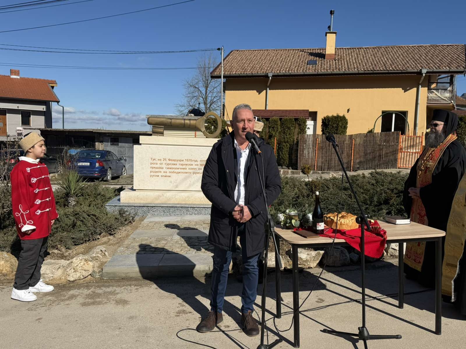 В своята реч Боян Минков – кмет на община Белоградчик, приветства всички гости и граждани на града с думите: „Изключително съм щастлив, защото сбъднахме една наша мечта – заедно с Иван Трифонов преди изборите си казахме, че ще строим много паметници в Белоградчик, паметници, от които имаме толкова голяма нужда. Днешният ден е специален не само заради това, че Белоградчик на този ден е получил своята свобода, а е и специален заради това, че с този паметник ние показваме уважението си към хората, които са освободили нашия град, хората които са дали живота си за свободата на България – това са румънските и руските войски, които правят Белоградчик свободен. Ще продължаваме да строим паметници, защото за Белоградчик това е много важно. Гордейте се, носете родния си град в сърцата си и обичайте България. Честит празник на всички!”