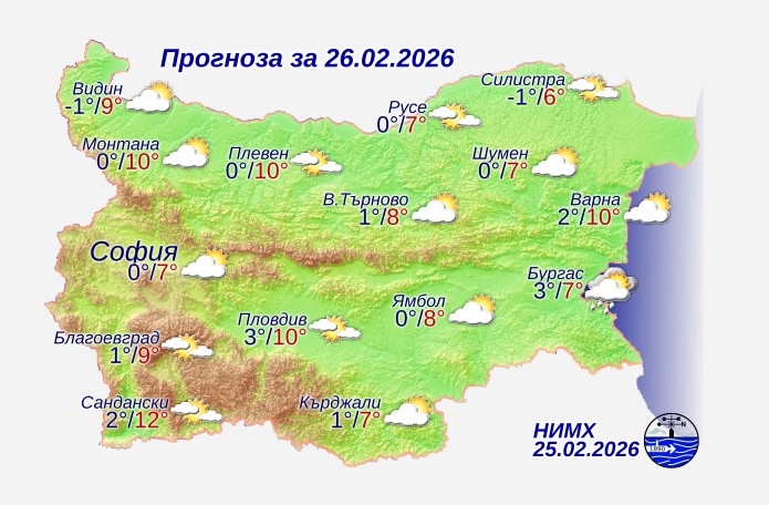 Днес облачността ще се разкъсва и ще намалява и над по-голямата част от страната ще е предимно слънчево. Ще продължи да духа умерен вятър от север-североизток и постепенно ще се ориентира от север-северозапад. Максималните температури ще са между 5° и 10°, в Югозападна България до 12°, в София – около 7°.