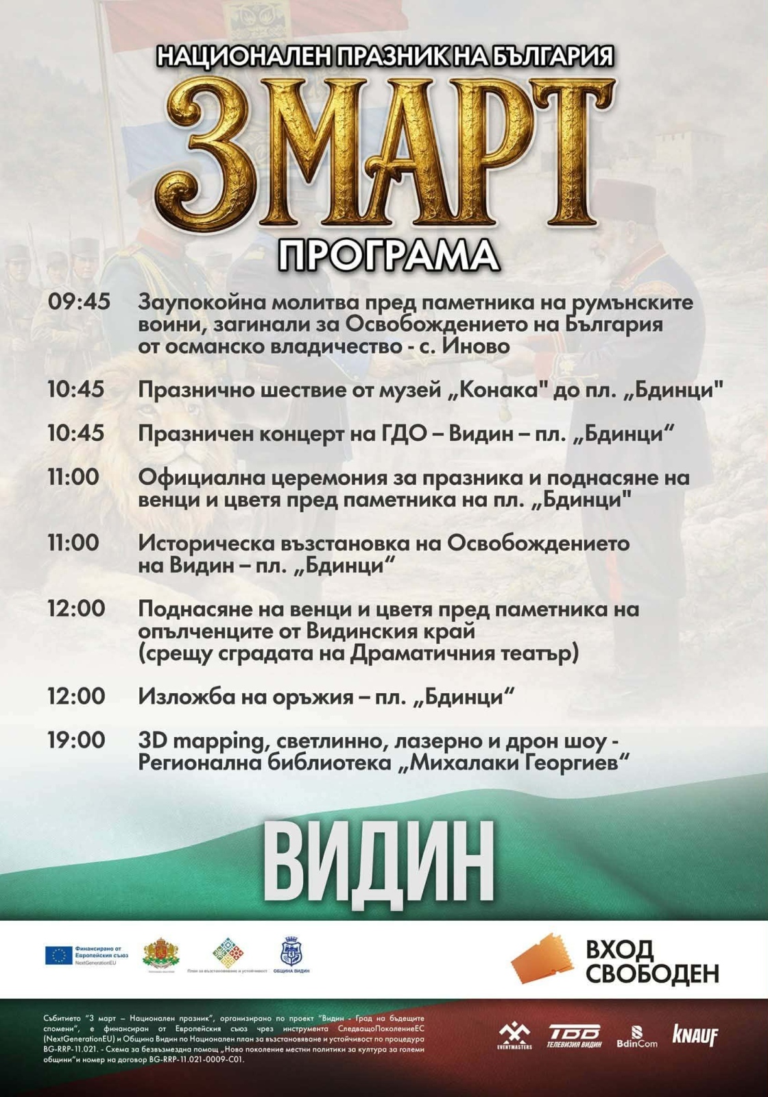 Екипът на Областен информационен център-Видин информира гражданите и всички заинтересовани страни в област Видин, че за първи път с европейски пари в гр. Видин ще бъде отбелязан националния празник на Република България (Освобождението от османско владичество). Утрешният трети март е финансиран от ЕС със сумата от 113 506 евро (съгласно ИСУН).
