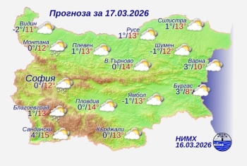 Днес над по-голямата част от страната облачността ще бъде значителна. В следобедните часове на места, главно в планинските райони на Западна България, ще има превалявания от дъжд, а по високите планински части – от сняг. Ще духа умерен източен вятър. Максималните температури ще бъдат между 10° и 15°, за София – около 12°.