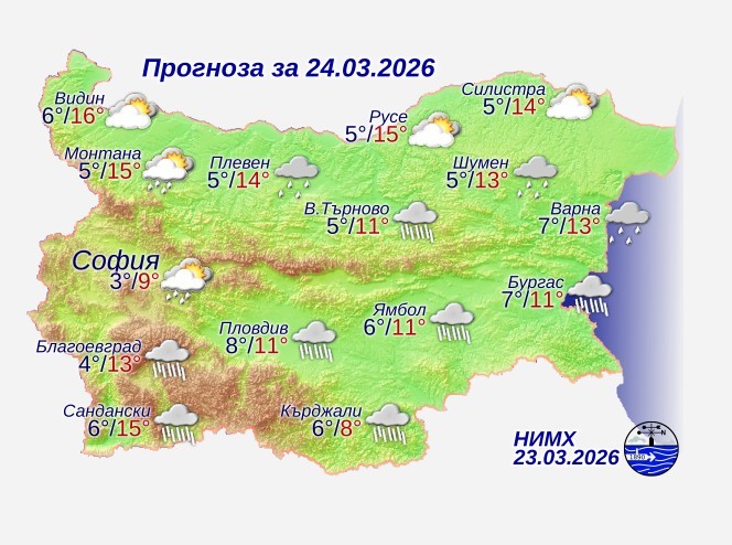 Времето над страната ще остане облачно, на много места с валежи от дъжд. По-интензивни и значителни ще са валежите през нощта в Централна и Югоизточна България, а през деня в района на Източните Родопи. Почти без валежи ще бъде през деня над северните райони, а след обяд от северозапад ще започне разкъсване и намаление на облачността. Вятърът ще бъде слаб и умерен от североизток. Минималните температури ще бъдат между 3° и 8°, в София – около 3°. Максималните температури ще бъдат от 8° в Кърджали и Хасково, където ще вали почти непрекъснато до около 16° в северозападните райони, в София – около 9°.