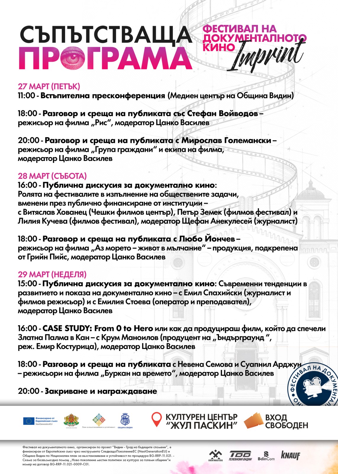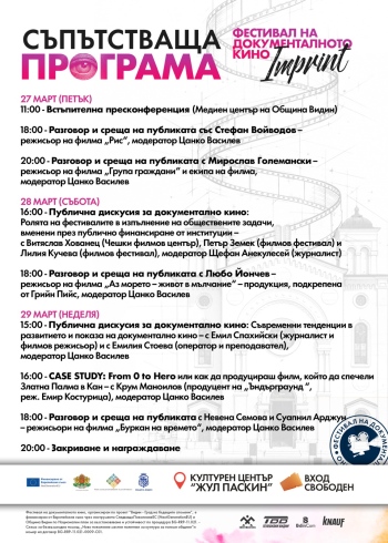 От 27 до 29 март Видин ще бъде домакин на първото издание на Фестивал на документалното кино „Imprint“ – събитие, което събира на едно място съвременно европейско и световно документално кино, автори и публика в търсене на смислен диалог.