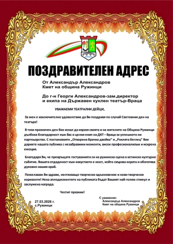 Специални поздравления за безупречната организация и високото художествено ниво на продукцията бяха отправени към Георги Александров – заместник-директор на ДКТ Враца, чийто принос за успеха на представлението бе високо оценен.