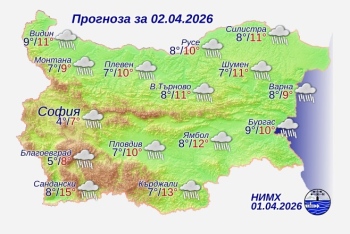 На много места ще има валежи от дъжд, главно в Южна България и планините значителни по количество. Вятърът ще е умерен временно силен от изток-североизток, след обяд в централните южни райони от юг. Минималните температури ще бъдат между 4° и 9°, в София – около 4°, максималните – между 7° и 12°, в София – около 7°.