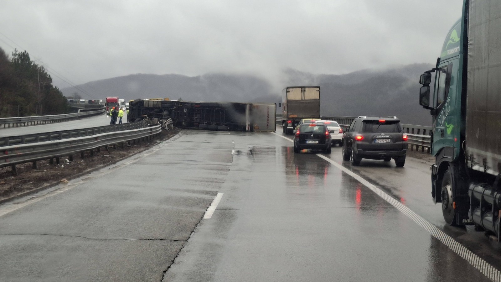 ТИР се е преобърнал на автомагистрала „Хемус“ след втория тунел. Тежкият камион е пътувал от София в посока Ботевград. При инцидента са затапени и двете ленти за движение. Преминаването е възможно само в аварийната лента. Вече са се образували опашки от чакащи автомобили. До изтеглянето на обърнатия камион шофьорите могат да изберат трасето през дефилето.