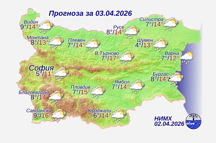 Днес ще се задържи предимно облачно и на много места ще има валежи от дъжд. Вятърът ще бъде слаб от изток-североизток. Минималните температури ще са между 4° и 9°, в София – около 5°. Дневните температури ще се повишат и максималните ще са между 11° и 16°, в София – около 11°.