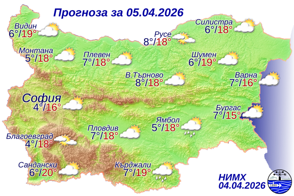 През нощта ще започне разкъсване и намаление на облачността. Все още на отделни места в планинските и югоизточните райони ще има превалявания от дъжд. Вятърът в повечето места ще стихне. Сутринта в низините и около водните басейни ще има намалена видимост и ниска облачност. Минималните температури ще бъдат между 3° и 8°, за София – около 4°. Утре ще бъде предимно слънчево. Около и след обяд ще се развива купеста облачност. На отделни места, главно в планинските райони, ще превали краткотраен дъжд. Ще духа слаб, в Дунавската равнина и временно умерен вятър от запад-северозапад. Максималните температури ще бъдат между 15° и 20°, за София – около 16°.