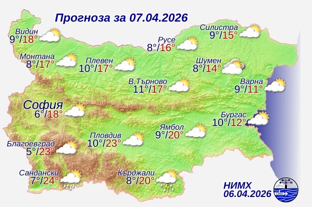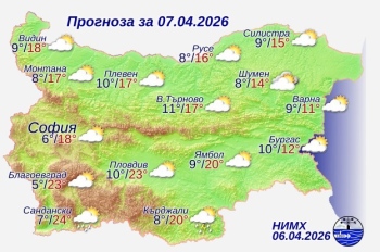Минималните температури ще са между 6° и 11°, в София – около 6°. Днес облачността ще е променлива, след обяд - често значителна. В района около Родопите ще се развива купесто-дъждовна облачност и ще има краткотрайни, временно интензивни валежи и гръмотевици. Западният вятър ще се усили, ще е умерен до силен и поривист. Максималните температури ще са между 15° и 20°, в югозападните райони - до около 24°. В София максималната температура ще е 18°.