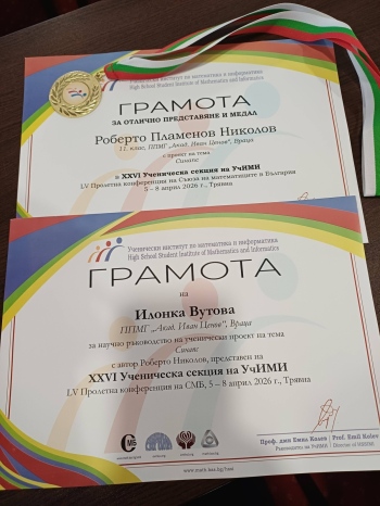 Роберто Николов (XI клас) от Профилираната природо-математическа гимназия постигна изключителен успех на 55-ата Пролетна конференция на Съюза на математиците в България и 26-ата Ученическа секция на Института по математика и информатика към БАН. Престижното събитие се проведе в град Трявна и събра най-талантливите млади изследователи в страната.