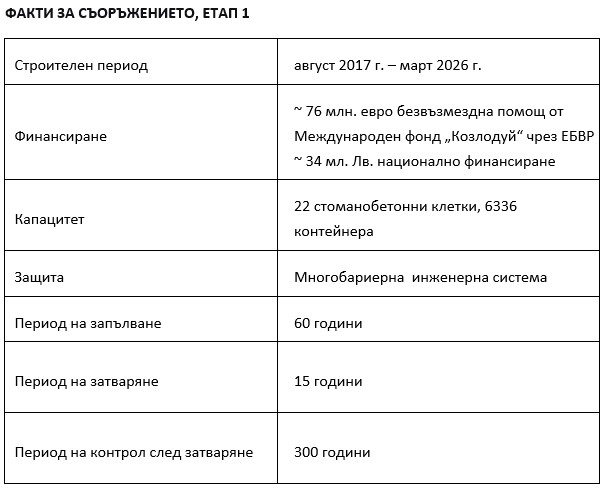 С официалното откриване беше даден старт на работата на Етап 1 от Хранилището, предназначен за радиоактивните отпадъци от извеждането от експлоатация на блокове 1-4 на АЕЦ „Козлодуй“. Дилян Петров подчерта, че в хранилището няма да се съхранява отработено ядрено гориво, нито отпадъци от други държави. То е предназначено в Етап 1 единствено за ниско- и средноактивни отпадъци от извеждането от експлоатация.
