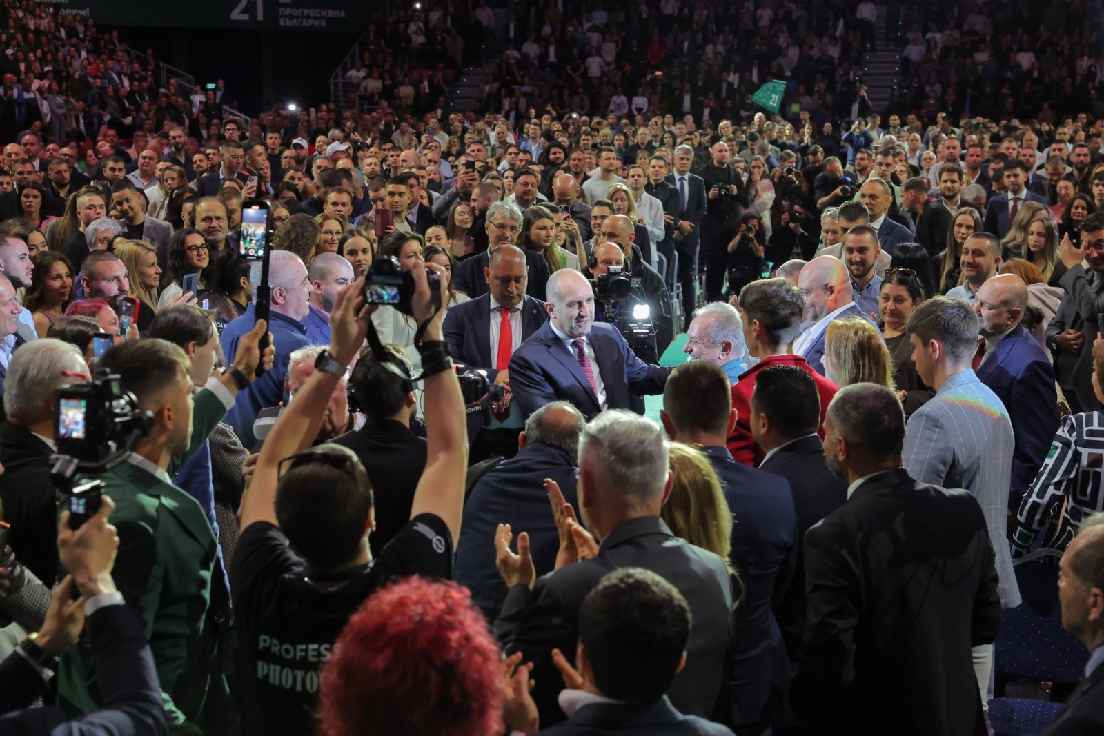 „Усещам силата на достойните хора зад мен и зареждащата енергия на хилядите достойни и свободни българи в тази зала", заяви лидерът на Прогресивна България Румен Радев, като благодари на присъстващите за подкрепата.