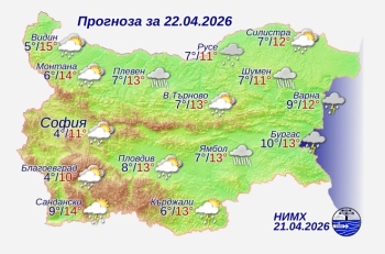 Днес облачността ще е предимно значителна и на места ще има валежи от дъжд. По-интензивни и с гръмотевици ще са явленията в крайните южни и североизточни райони. Вятърът ще е слаб до умерен от север, в Източна България от изток. Максималните температури ще бъдат между 10° и 15°, в София – около 11°.