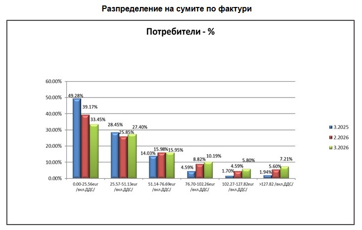 - Промени в крайните сегменти: Намалението на дела на най-ниските сметки и увеличението на високите се дължи както на климатичните условия, така и на спецификата при клиентите, които все още са на прогнозни начисления.