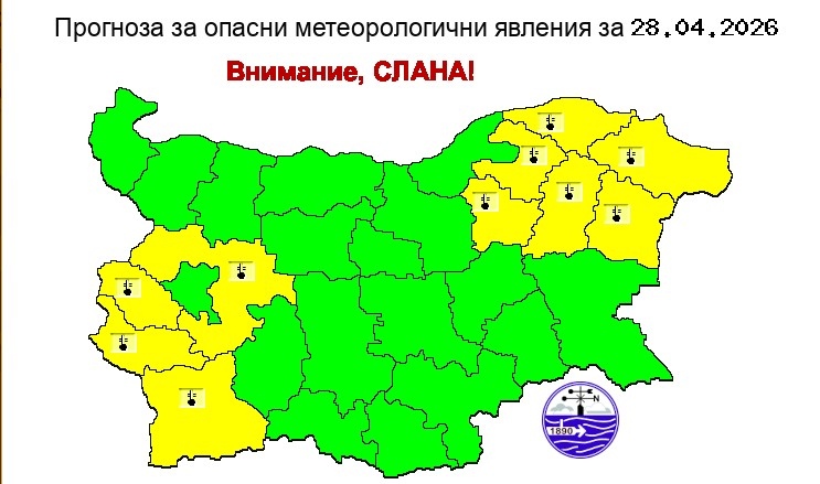 Минималните температури ще бъдат между 2° и 7°, в София - около 3°. На отделни места в североизточните райони и в котловините на Югозападна България ще има условия за образуване на слана. Днес ще е предимно слънчево. След обяд над югозападната част от страната ще се развива купесто-дъждовна облачност и на места главно в планинските райони ще има краткотрайни валежи от дъжд с гръмотевици. Ще духа слаб северен вятър, в Източна България от изток-югоизток. Максималните температури ще бъдат между 20° и 25°, в София - около 21°.